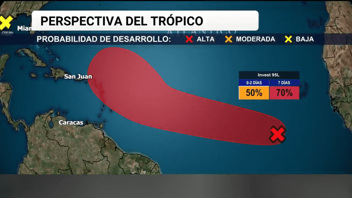 El Centro Nacional de Huracanes (NHC, por sus siglas en inglés) aumentó este domingo a un 70 % la posibilidad de que el sistema Invest 95L evolucione a un ciclón en los próximos siete días, mientras avanza con rapidez por aguas del Atlántico tropical.
