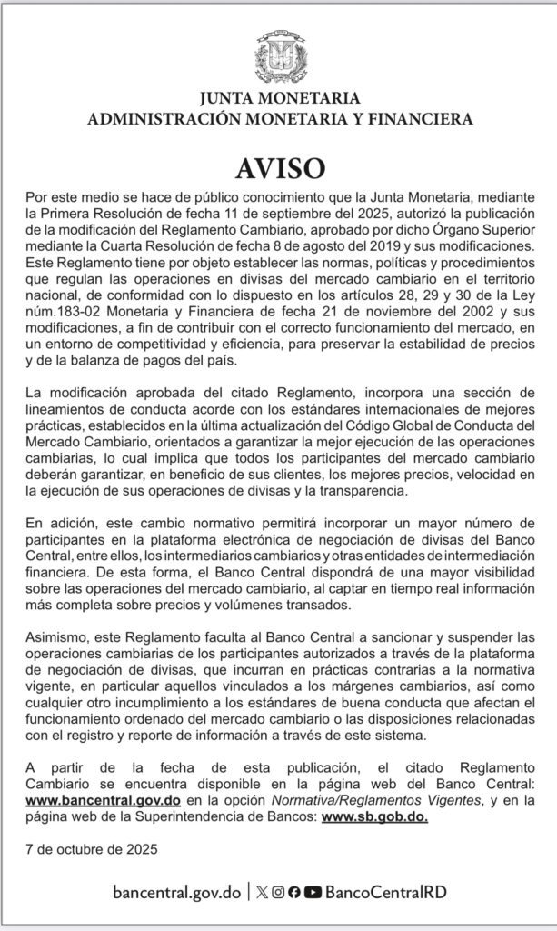 Un comunicado de este lunes establece que el reglamento actualizado busca afinar las operaciones cambiarias bajo un marco más estricto, con el propósito de que el mercado funcione con mayor eficiencia, transparencia y competencia. La norma está sustentada en los artículos 28, 29 y 30 de la Ley Monetaria y Financiera (núm. 183-02), y se alinea con estándares internacionales de conducta.