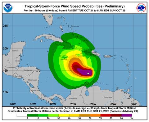 Para mañana miércoles, la previsión es que Melissa se mantenga al sur/suroeste del país, en aguas del mar Caribe. En estas condiciones de alta humedad e inestabilidad, desde la madrugada se desarrollarán aguaceros moderados a fuertes, tormentas eléctricas y ráfagas de viento, con mayor intensidad hacia la costa caribeña y el suroeste del país: podrían ocurrir lluvias momentáneamente torrenciales, con riesgo elevado de inundaciones urbanas repentinas. Por tanto, la población debe mantenerse atenta a las actualizaciones emitidas por Protección Civil y los organismos meteorológicos.