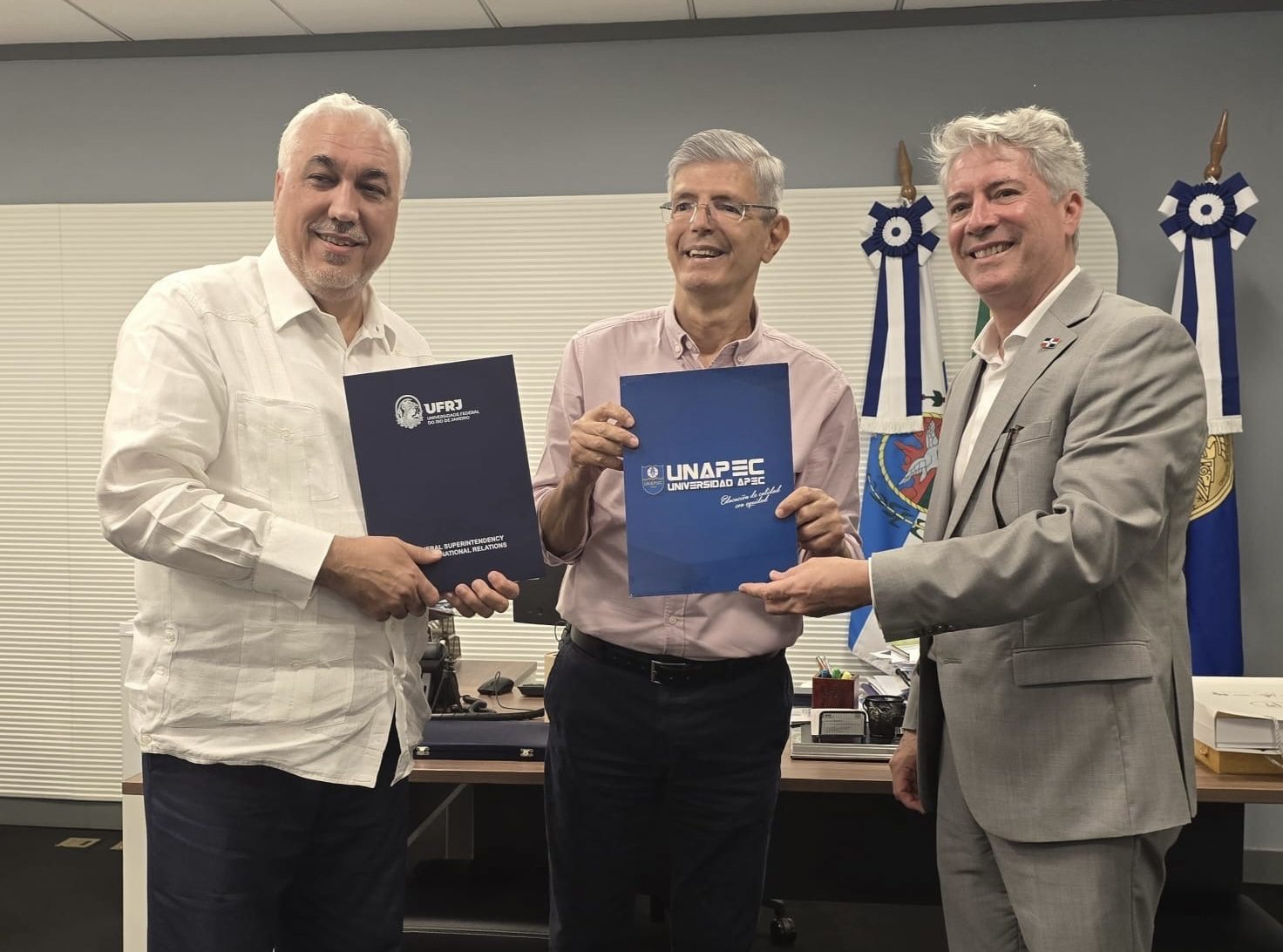 El acuerdo fue suscrito en la sede de la UFRJ por su rector, profesor Roberto Medronho, y el doctor Erik F. Pérez Vega, rector de UNAPEC. Ambos coincidieron en destacar el valor estratégico del pacto, que promueve la cooperación en áreas clave como innovación tecnológica, sostenibilidad, transformación digital y movilidad universitaria.